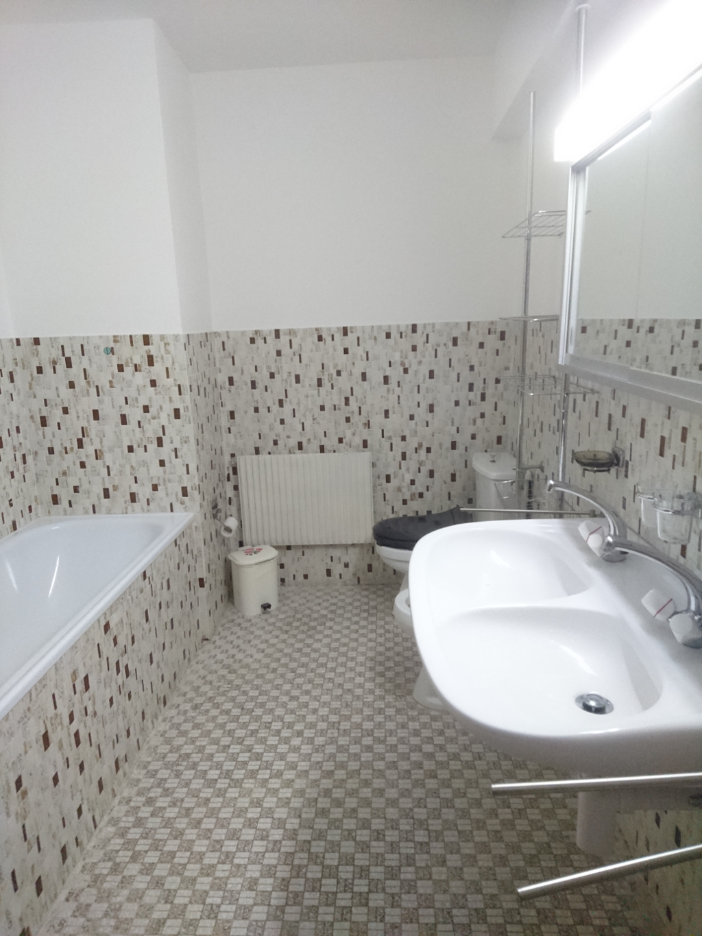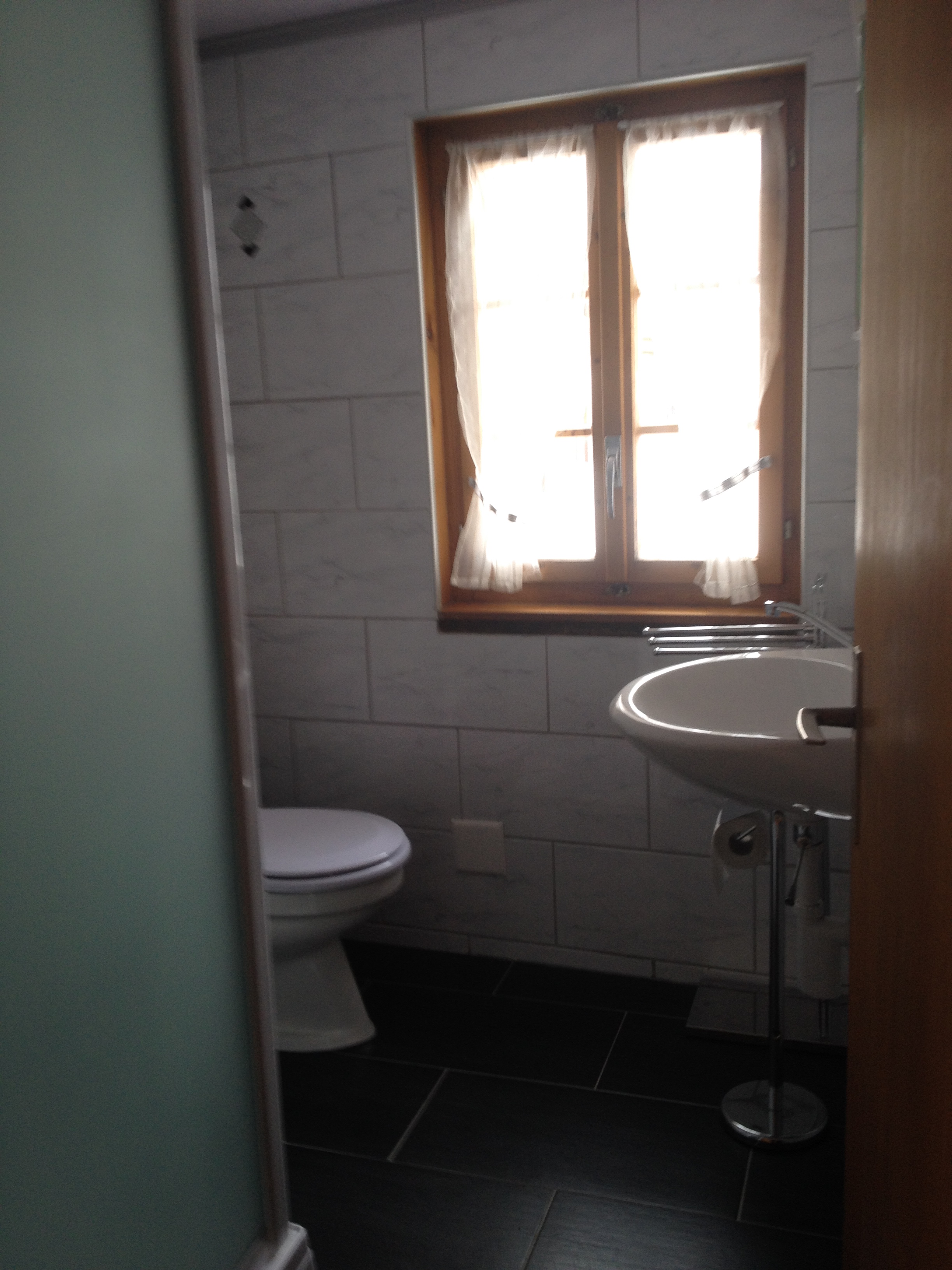 Die Dusche mit WC liegt im unteren Bereich, sowie die Küche und das Wohnzimmer.